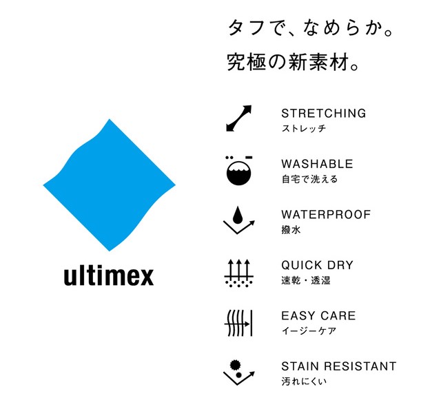 WWS独自のタフでなめらかな新素材「ultimex(アルティメックス)」が使用されており、洗濯機で丸洗いしてもしわになりにくく、どのような体勢でもフィットするストレッチ性と、3時間ほどで乾くという機能性と快適さを兼ね備えています。